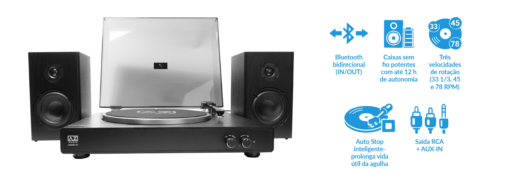 Conexão completa com RCA e AUX: Conexão em caixas amplificadas com funções BT ou com fio em caixas passivas na função PHONO. E utilize a entrada auxiliar P2 das caixas do AZ-LP60XBT para conexão do seu áudio via cabo.